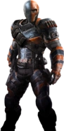 - Chociaż Batman: Arkham Knight dzieje się około dziesięć lat po wydarzeniach z Batman: Arkham Origins, Deathstroke nadal nosi tę samą czarno-pomarańczową zbroję, którą miał dziesięć lat temu, co czyni go jedyną postacią w serii, która w ogóle się nie zmieniła pod względem designu. Chociaż wydaje się, że Deathstroke nieco schudł, ponieważ zbroja jest mniej gruba, a naramienniki bardziej sięgają jego głowy (biorąc pod uwagę, że Deathstroke jest najpewniej po pięćdziesiątce w czasach Arkham Knight, prawdopodobnie stał się niższy i chudszy ze względu na swój podeszły wiek).