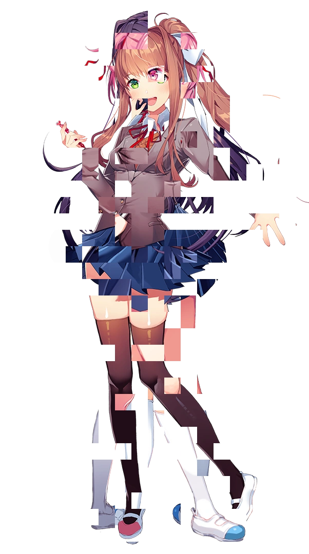 - Istnieją subtelne wskazówki, że Monika na początku nie pasuje do gry, ze względu na naturalnie ubarwione włosy, zachodnie imię, które nie kończy się na „i”, czarne skarpetki i różowe buty zamiast białych skarpet i niebieskich butów oraz portret od frontu, w przeciwieństwie do innych dziewcząt, które przynajmniej część swoich portretów mają pod kątem.